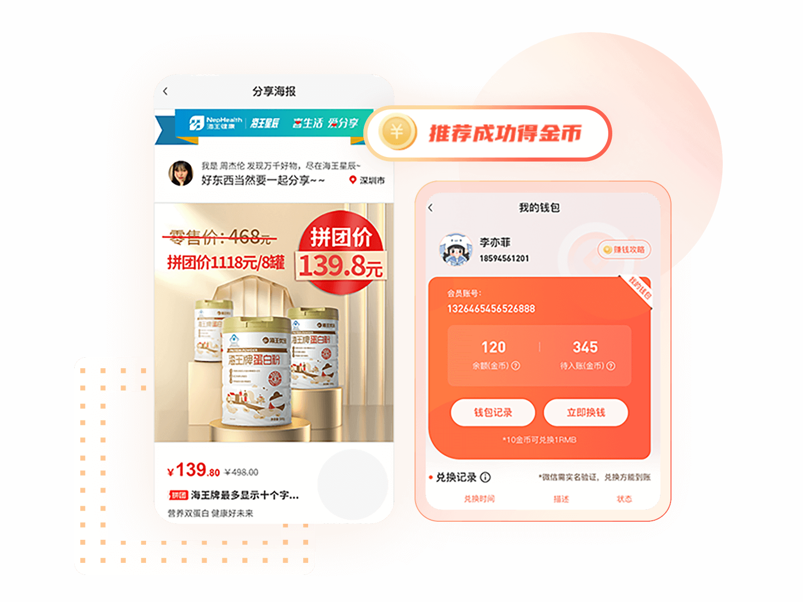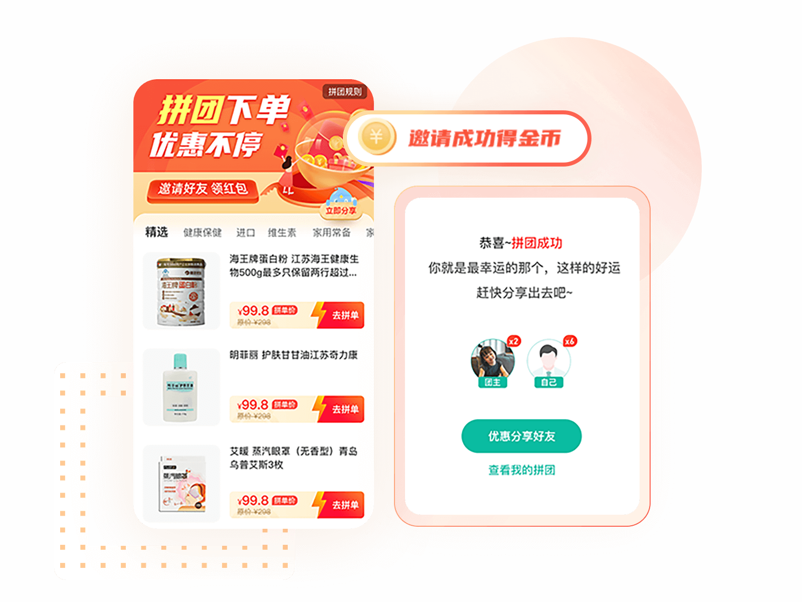 拼团低价购的同时,分享推荐拼团商品,还能获得金币