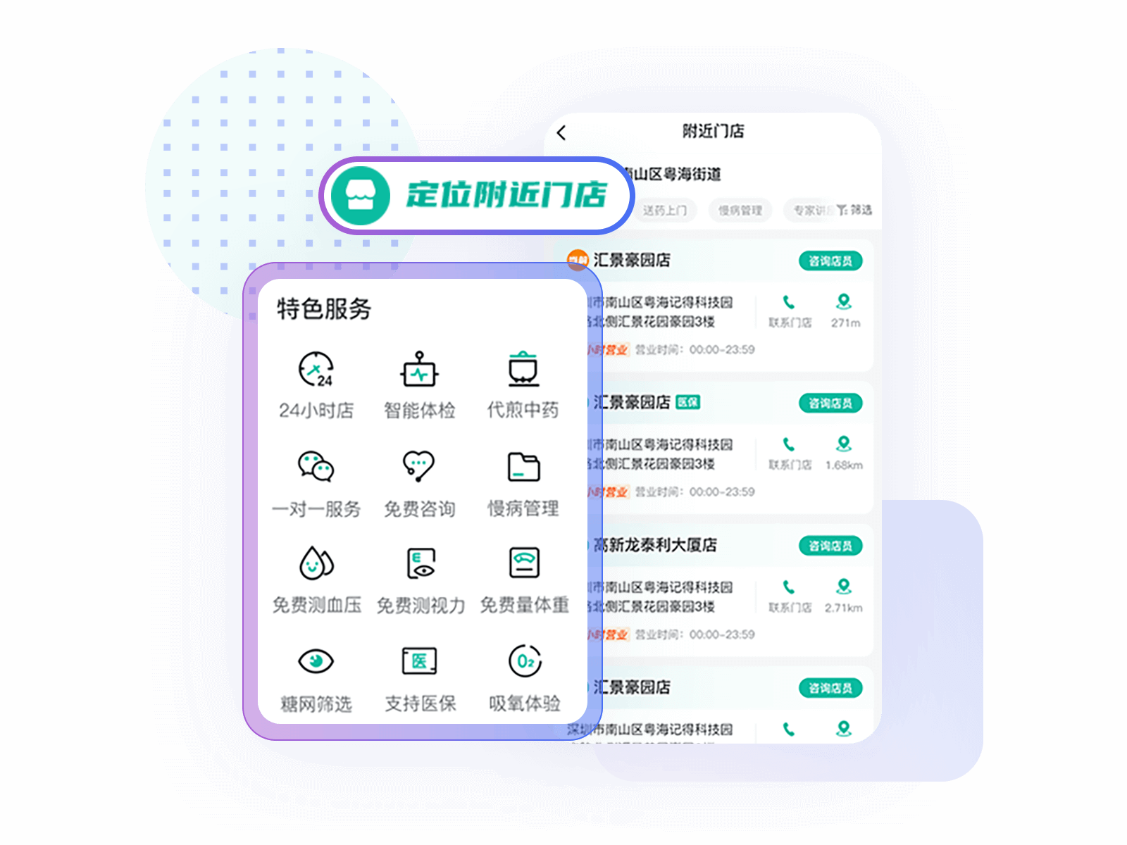 帮助用户快速找到周边门店,添加门店药师和健康顾问企业微信,提供一对一咨询服务,同时可查看周边门店提供中药代煎,雾化吸氧,