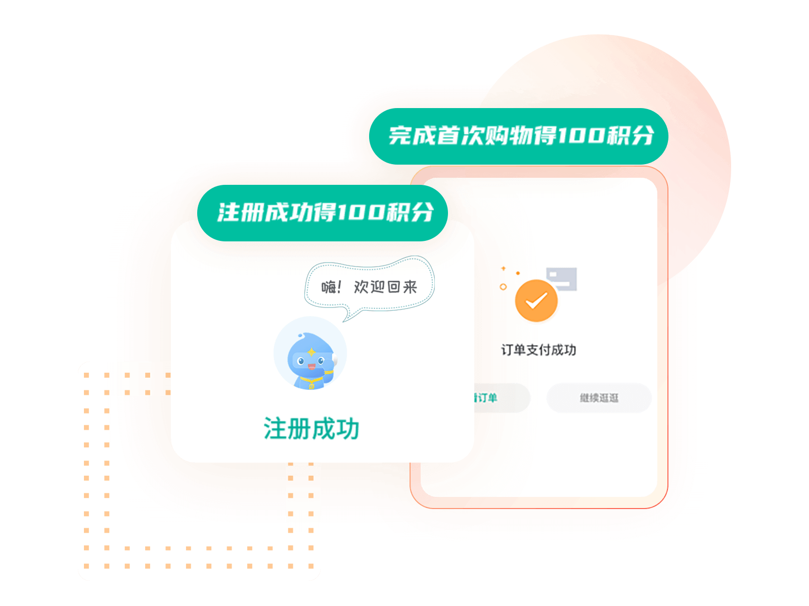 首次购物完成后,再送100积分。